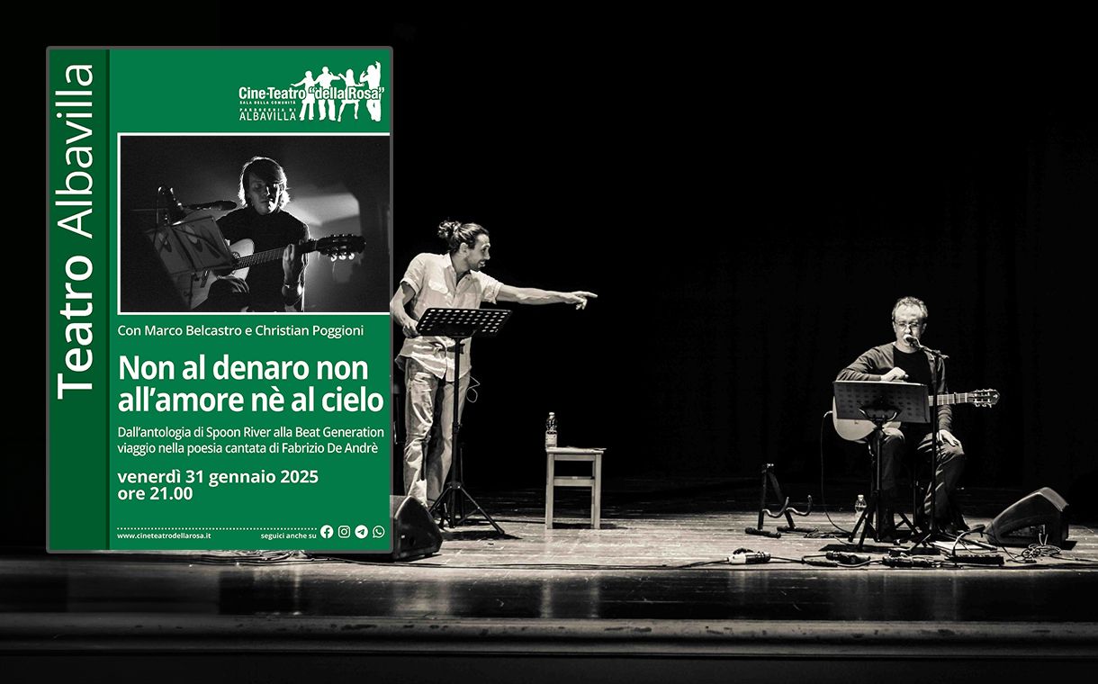 «Avrò avuto diciott’anni quando ho letto Spoon River. Mi era piaciuto, forse perché in quei personaggi trovavo qualcosa di me. Nel disco si parla di vizi e virtù: è chiaro che la virtù mi interessa di meno, perché non va migliorata. Invece il vizio lo si può migliorare: solo così un discorso può essere produttivo». Nel 1972 Fabrizio de André pubblicò l’album Non al denaro, non all’amore né al cielo, uno dei suoi dischi più noti e più belli, scritto in collaborazione con il futuro premio Oscar Nicola Piovani e liberamente ispirato all’Antologia di Spoon River di Edgar Lee Masters. Prendendo spunto dalle 9 canzoni del disco, Marco Belcastro e Christian Poggioni propongono uno spettacolo-concerto in cui i brani del cantautore genovese si intrecciano a testi di poeti del ‘900, dalla Beat generation a Alda Merini.
