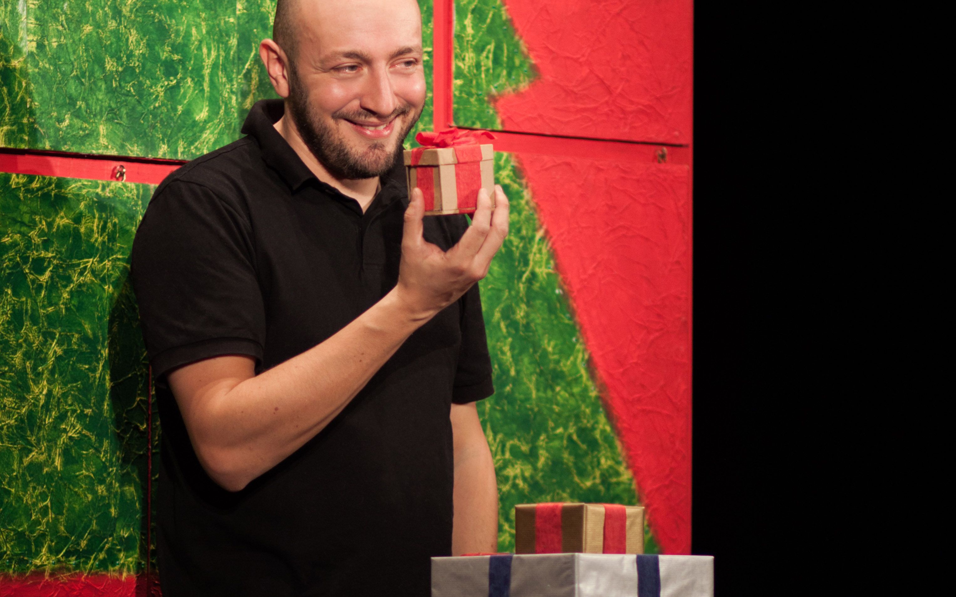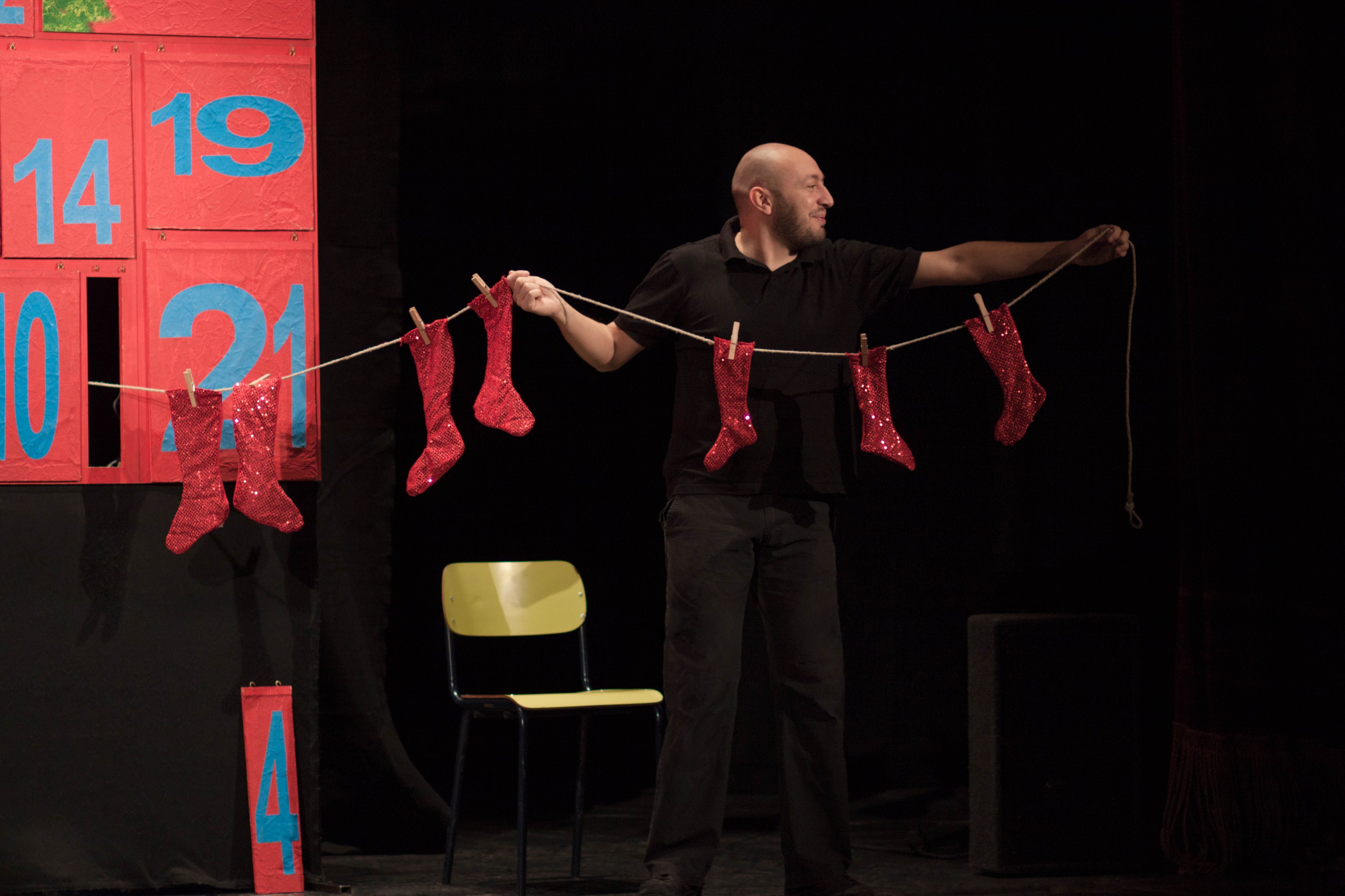 Dietro le porticine colorate si potrà trovare la storia del Fiocco di Neve che non vuole cadere per terra, quella del Colore di Babbo Natale, quella delle Carte da Regalo che sono tutte stropicciate, ma anche quella del Manto di Neve che entrerà in teatro e passerà sopra ai bambini, e molte altre ancora per arrivare all’ultima, piccola e luminosa storia della vigilia di Natale.